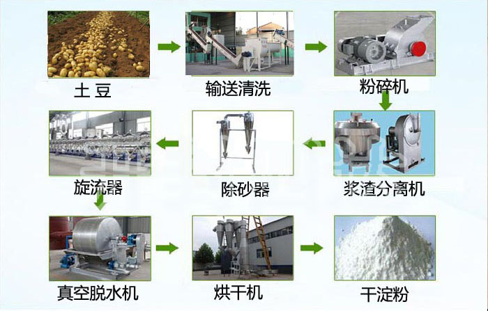 土豆→(清洗輸送機(jī))→清洗(清洗轉(zhuǎn)籠)→粉碎(錘片式粉碎機(jī)或銼磨機(jī))→漿渣分離(壓力曲篩或離心篩、漿渣分離園篩)→除砂(除砂器)→蛋白纖維分離(碟片分離機(jī)、濃縮凈化旋流器機(jī)組)→脫水(離心機(jī)或真空脫水機(jī))→烘干(低溫低塔氣流對撞淀粉烘干機(jī))→包裝入庫。
