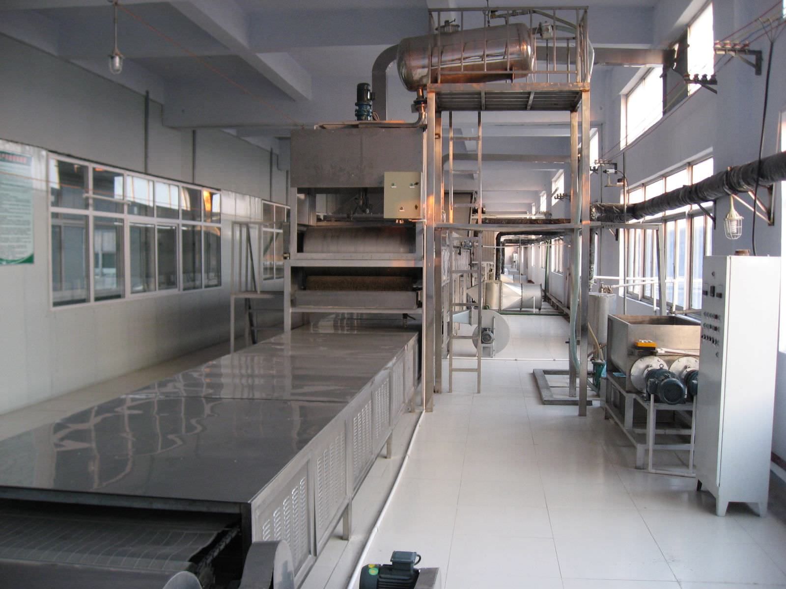 工藝流程:預(yù)熱→螺旋攪拌(恒溫儲(chǔ)料)→真空攪拌→刮板下料成型→蒸熟(蒸汽)→冷卻→脫離→常溫老化→低溫老化(冷庫(kù))→豎切絲→低溫大風(fēng)量定型干燥→降溫(進(jìn)冷風(fēng))→定長(zhǎng)橫切→包裝。