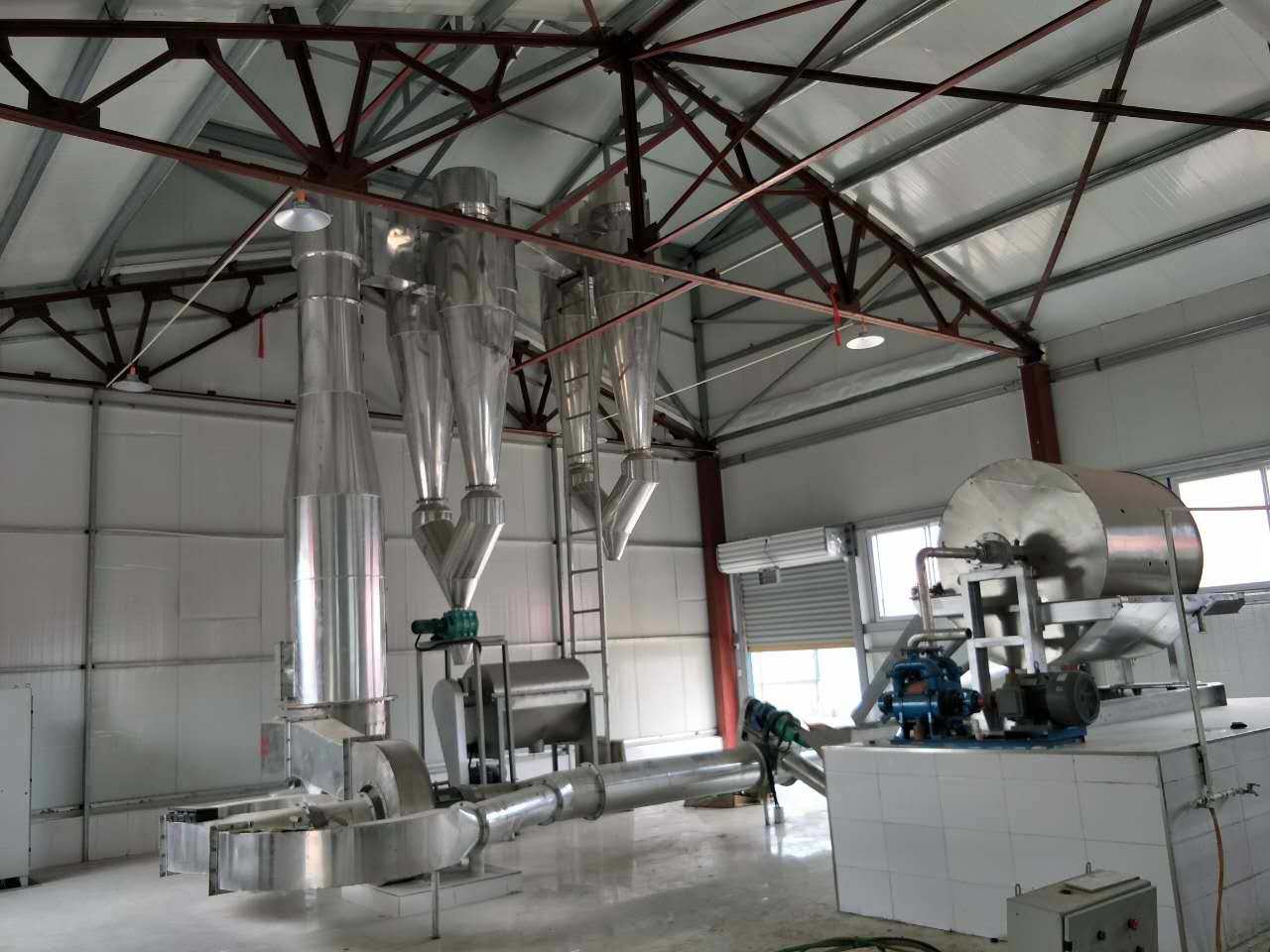 第三、熱風(fēng)爐點(diǎn)火后,必須啟動(dòng)烘干風(fēng)機(jī),使冷空氣冷卻爐壁,否則,會(huì)使?fàn)t壁過(guò)熱,損壞設(shè)備。當(dāng)熱空氣溫度達(dá)到50~55℃時(shí),啟動(dòng)進(jìn)料器電動(dòng)機(jī),開啟調(diào)速表,使物料緩慢進(jìn)入干燥管,隨著熱空氣溫度的逐漸升高,(正常工作應(yīng)保持在160℃左右)進(jìn)料器的轉(zhuǎn)速要同步提高,至之到穩(wěn)定生產(chǎn)。(以紅薯淀粉干燥為例,干燥器內(nèi)的混合溫度應(yīng)穩(wěn)定在50~55℃之間。溫度升高,可提高進(jìn)料器轉(zhuǎn)速,使進(jìn)料量增加,反之應(yīng)降低進(jìn)料器轉(zhuǎn)速。)