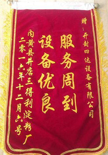 12月8日一早,開(kāi)封四達(dá)辦公室收到了一面鮮紅錦旗,內(nèi)黃客戶感謝四達(dá)公司為其設(shè)計(jì)安裝了一套性價(jià)比超高的日產(chǎn)10噸小麥淀粉加工設(shè)備。